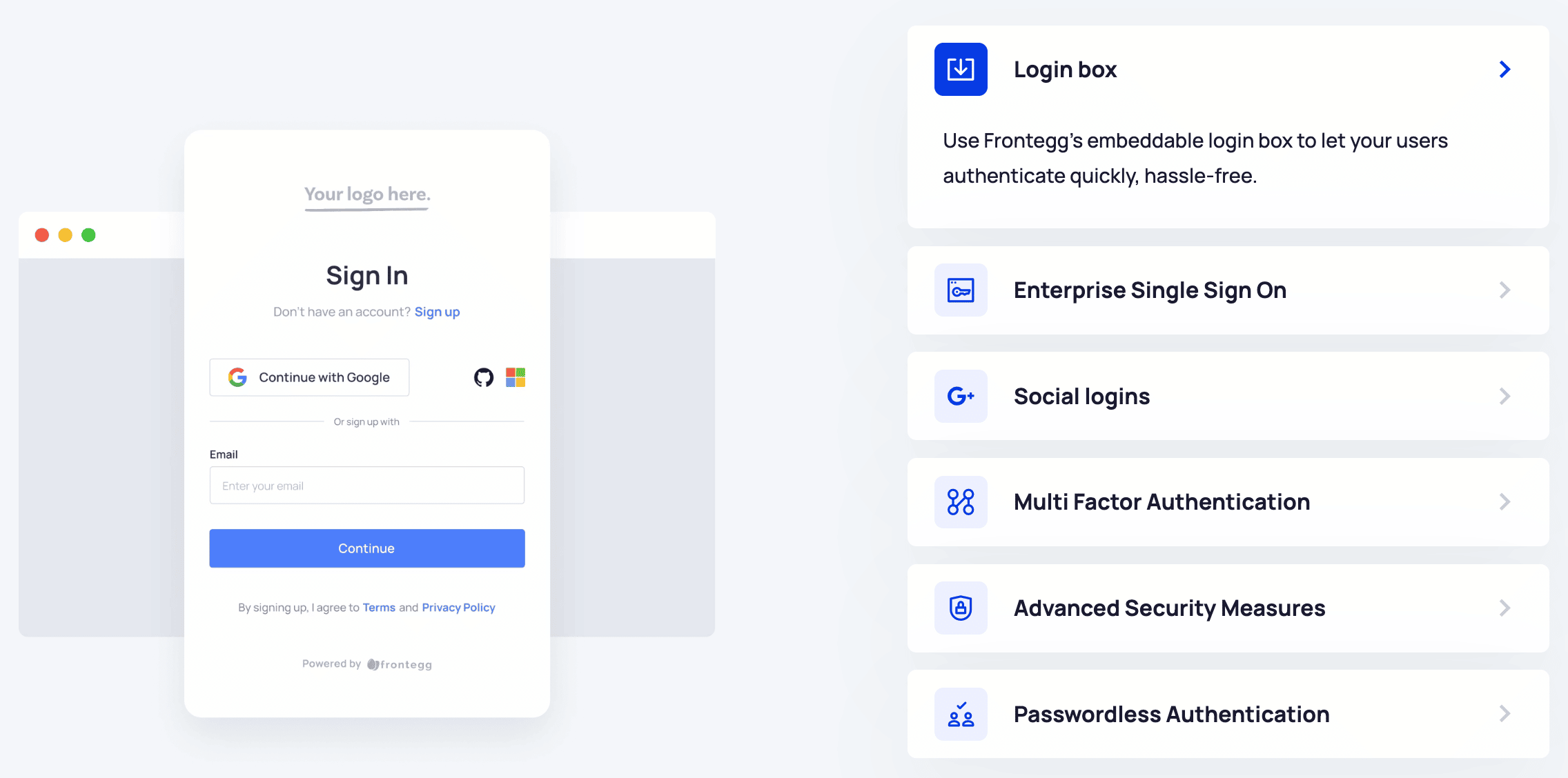 Pros: Frontegg is easy to implement and use, saving developers work so they can focus on product development. Customers can freely configure their application on their own.