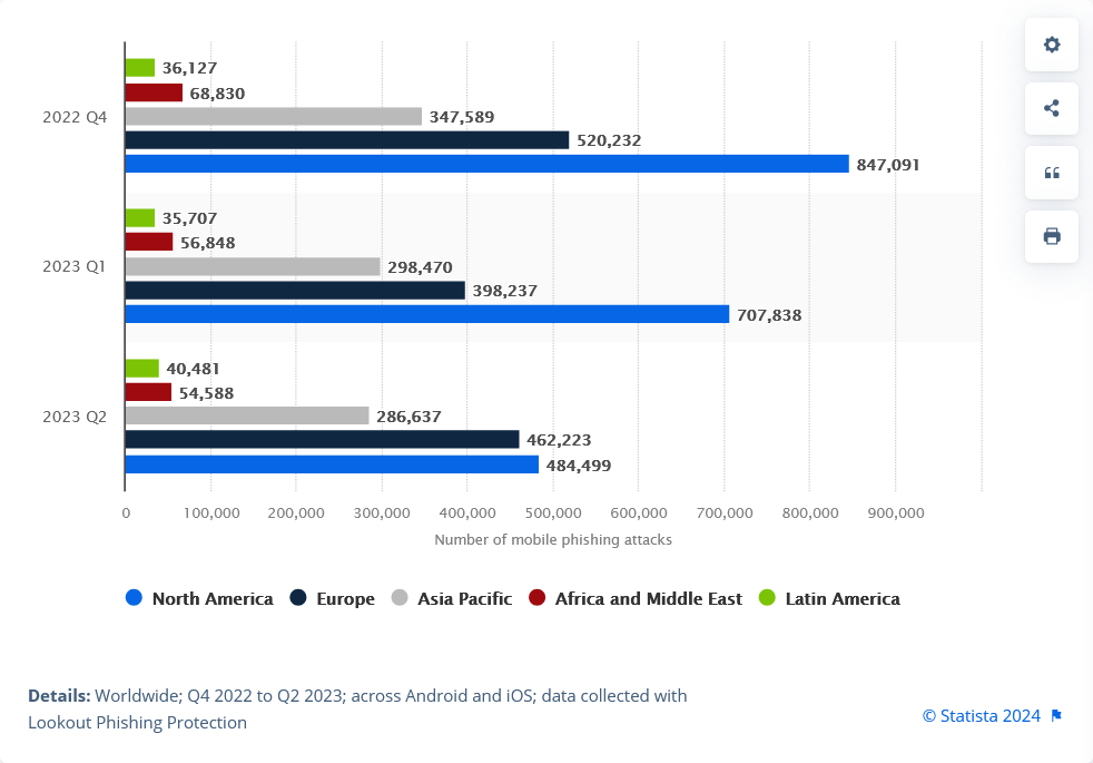 According to Statista, in the second quarter of 2023, North America topped the list for the highest number of mobile phishing attempts, with almost half-a-million mobile phishing attempts. Europe came in a close second, with 462 thousand.